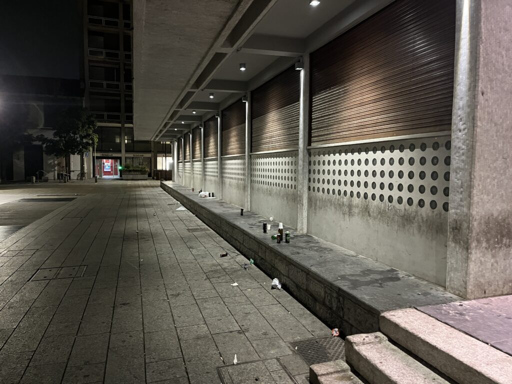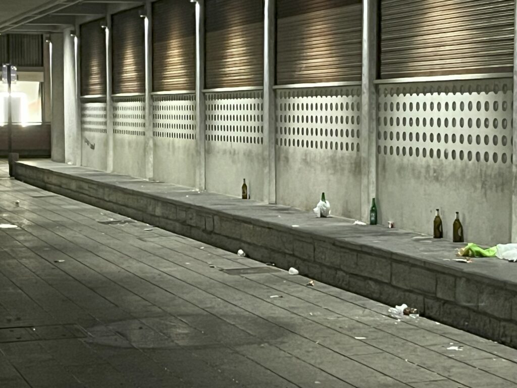 The abandoned wastes left by vagabonds on the sidewalk of Palazzo Terragni (former headquarters of the Fascist Party).